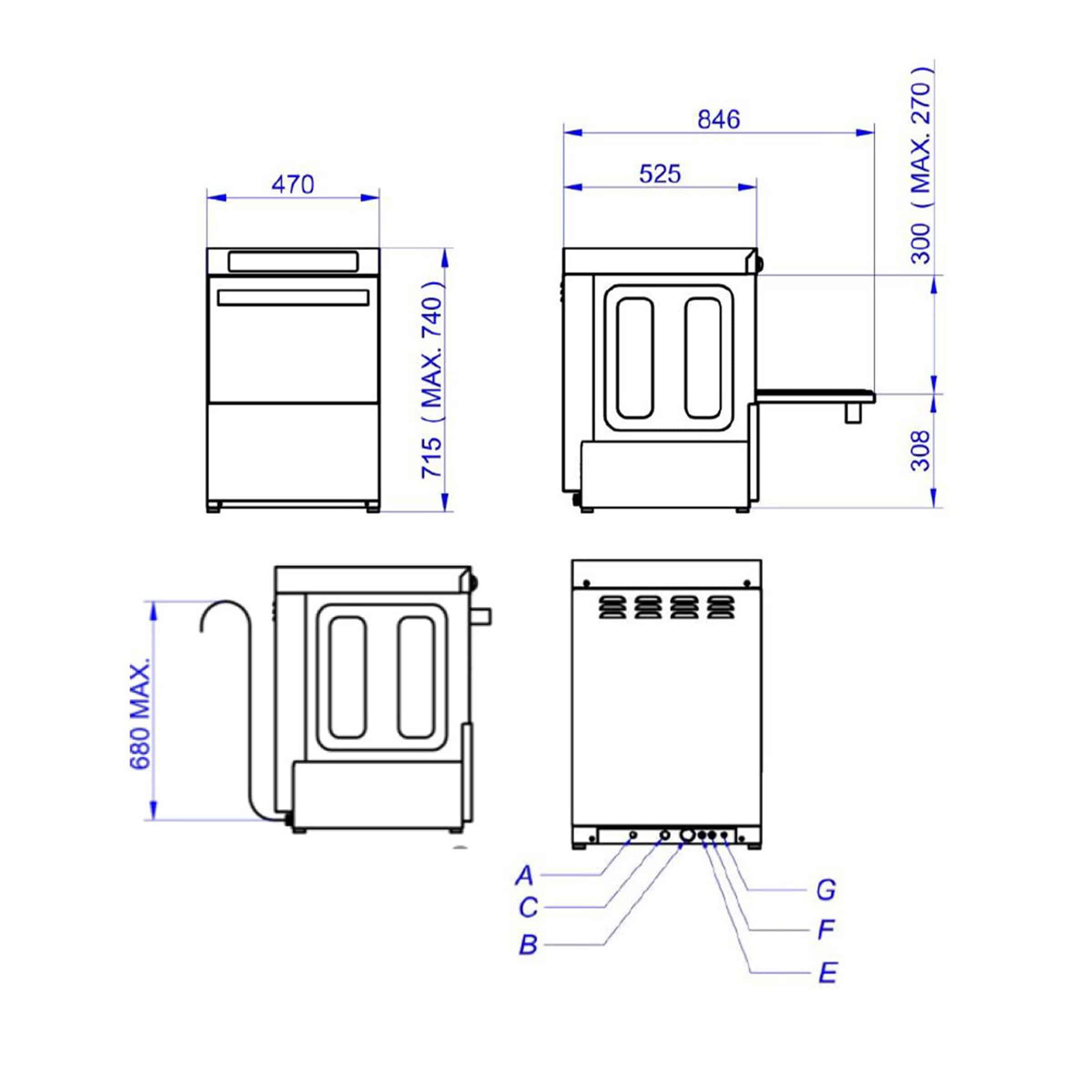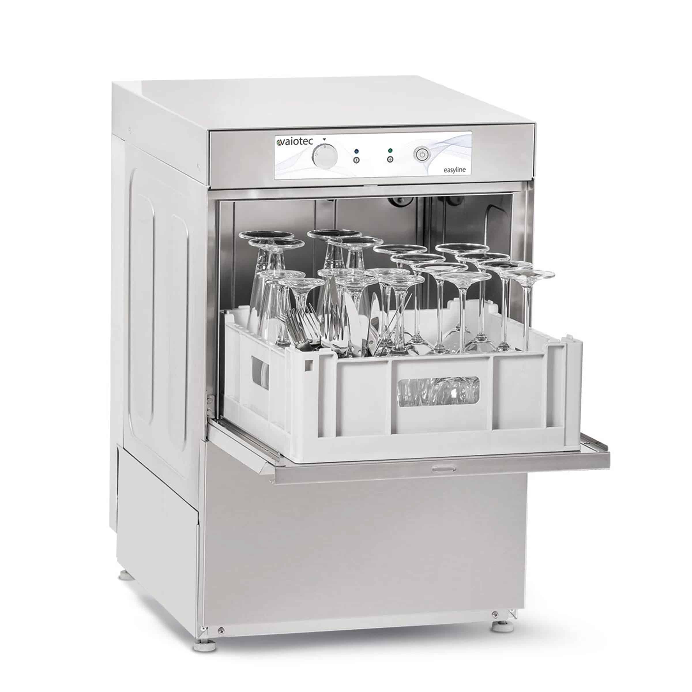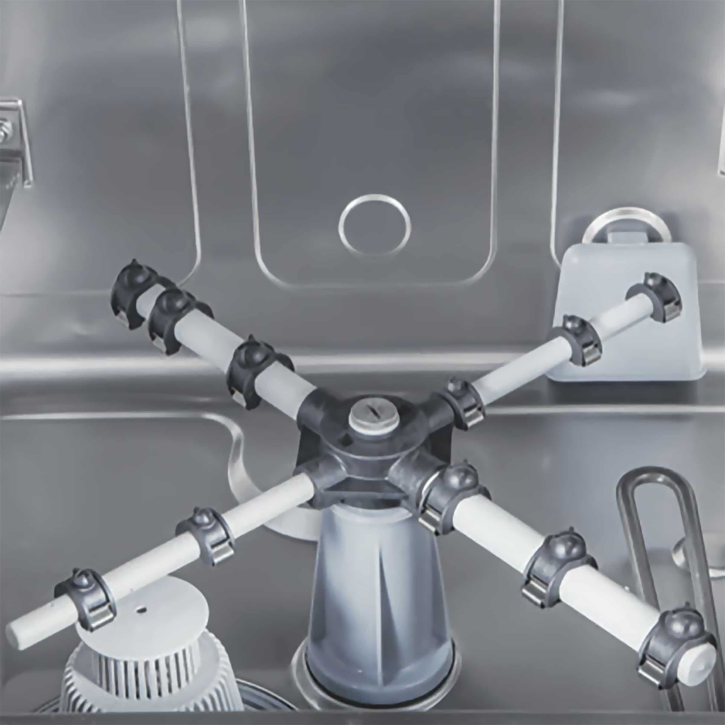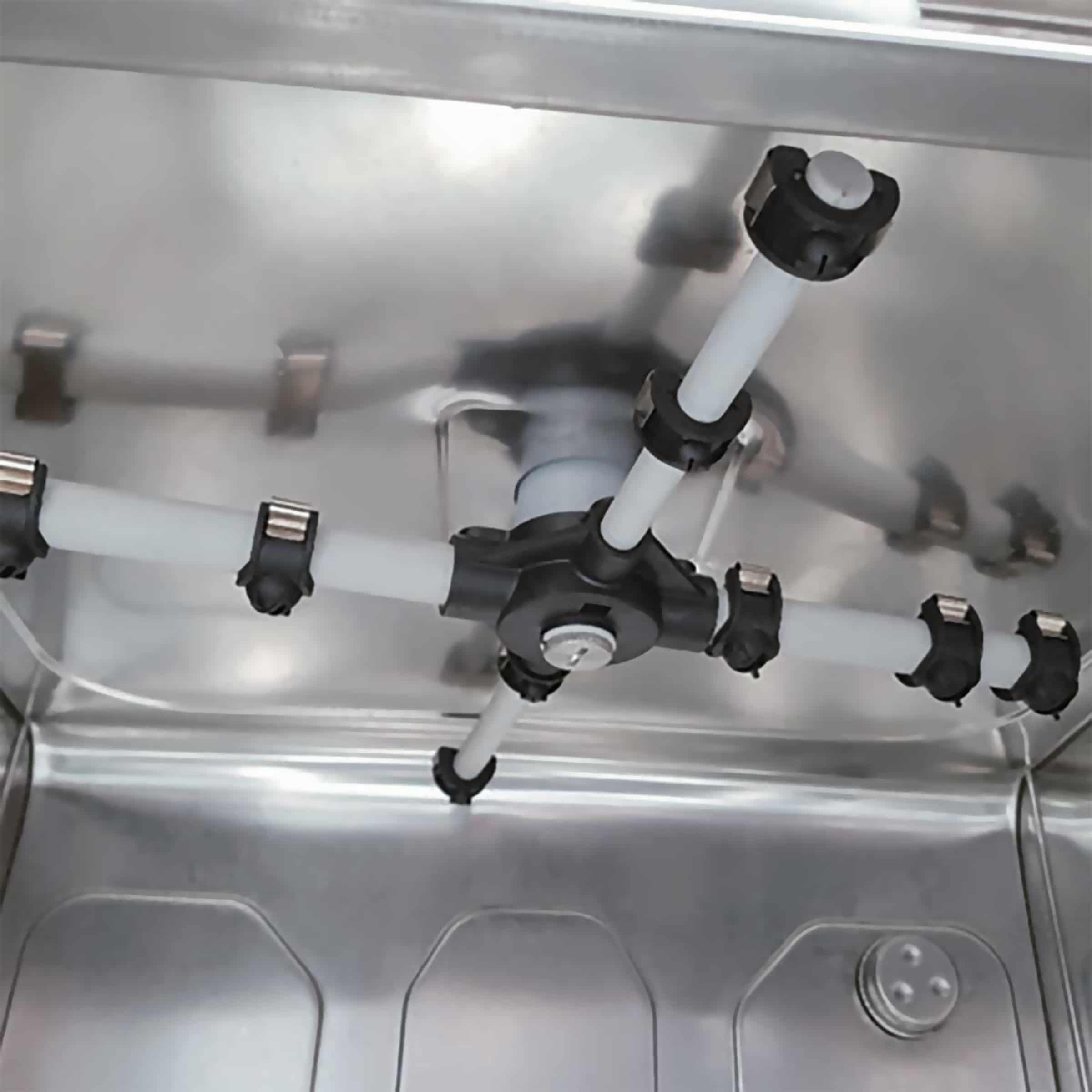 The height-adjustable wash arms ensure optimal cleaning, while the integrated dosing pumps for rinse aid and rinse aid ensure hygienic results. Thanks to the built-in drain pump, you place the machine where it suits you best, even without a direct floor drain. Safety is guaranteed with the thermostats in tank and boiler, and the anti-return valve prevents problems with backflowing water.