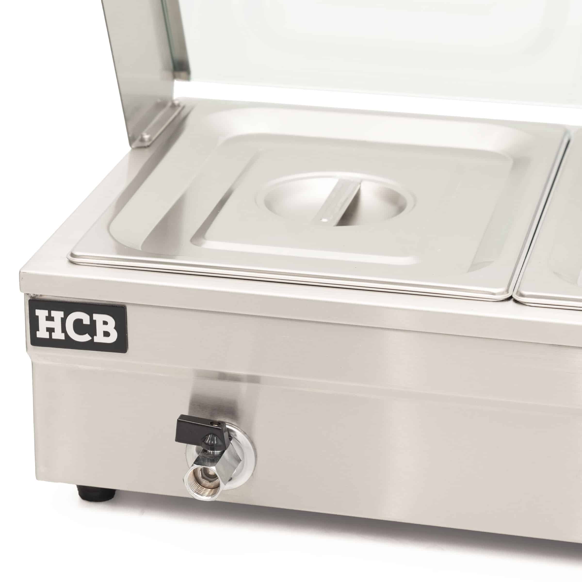 The Bain Marie comes with a convenient drain valve, making it easy to drain excess water and keep the unit clean. The drain valve is located at the front, making it easy to reach and empty the drain.