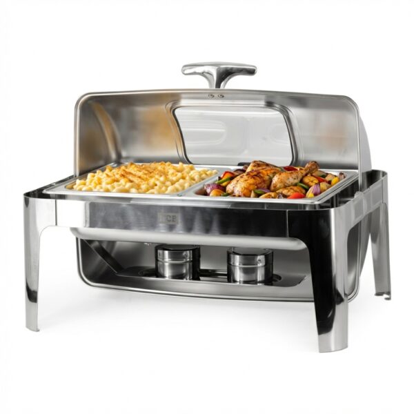 The hospitality industry is all about presentation, convenience and top quality. With this stylish chafing dish with rolltop and viewing glass, your dishes are not only perfectly warm, but also attractively presented. Thanks to the handy viewing glass, guests can immediately see what is being served, without having to open it unnecessarily – saving heat loss and time. The rolltop lid makes serving extra easy, even during the busiest peak times. This ensures smooth service and a neat appearance at any buffet, event or catering job.