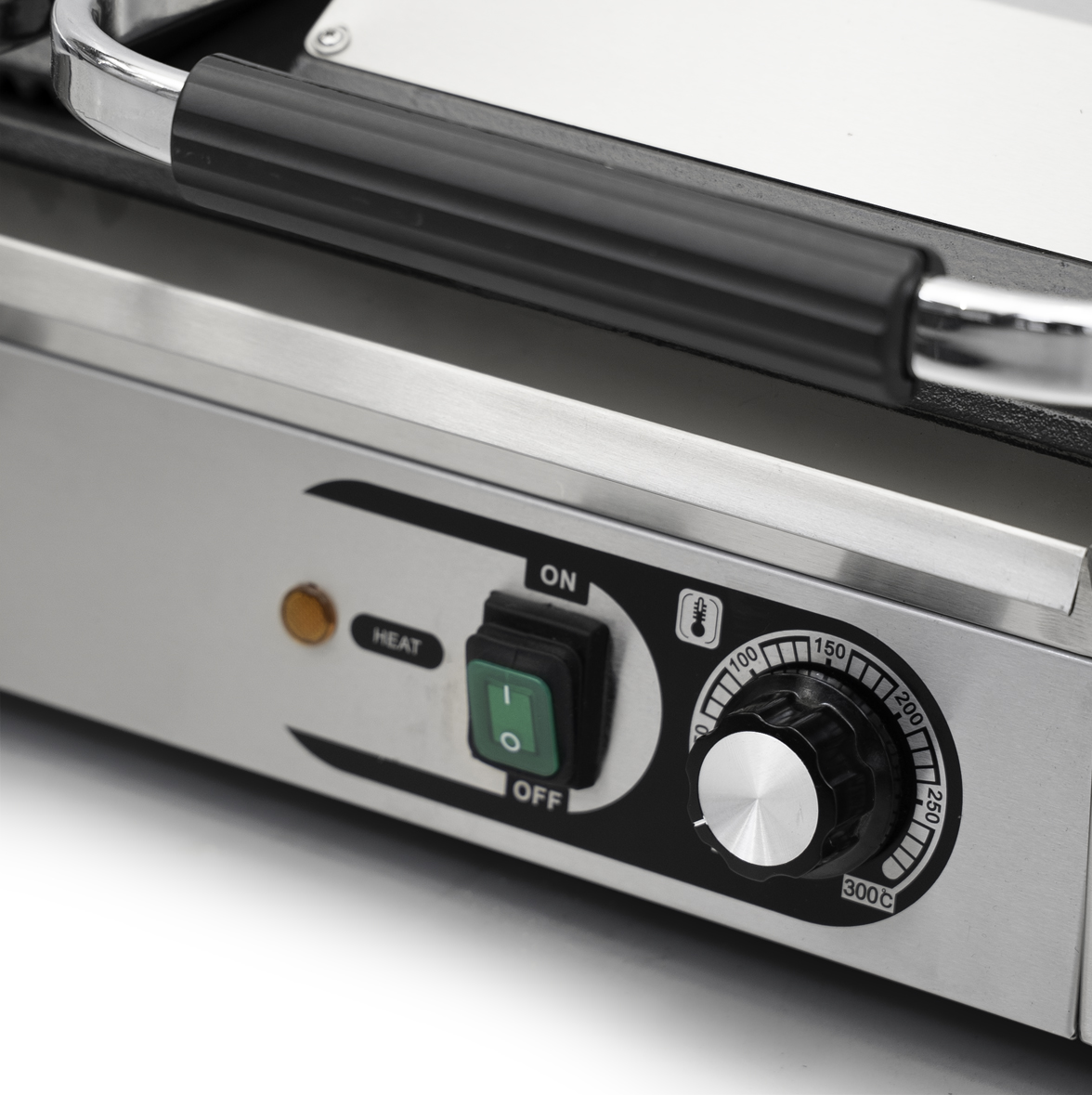 Made of high quality stainless steel, this Panini Grill has an elegant design that fits in any kitchen. With an output of 230V, this grill is powerful enough to heat quickly and evenly, grilling your sandwiches and paninis perfectly.