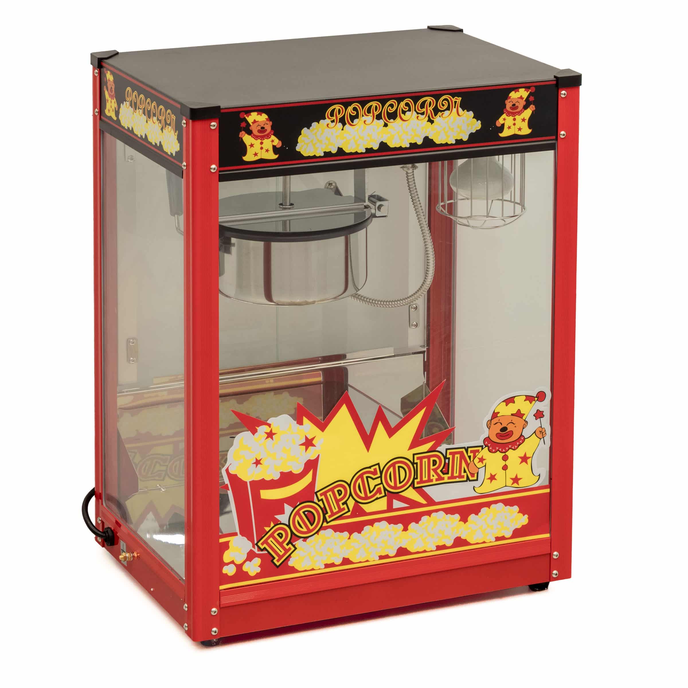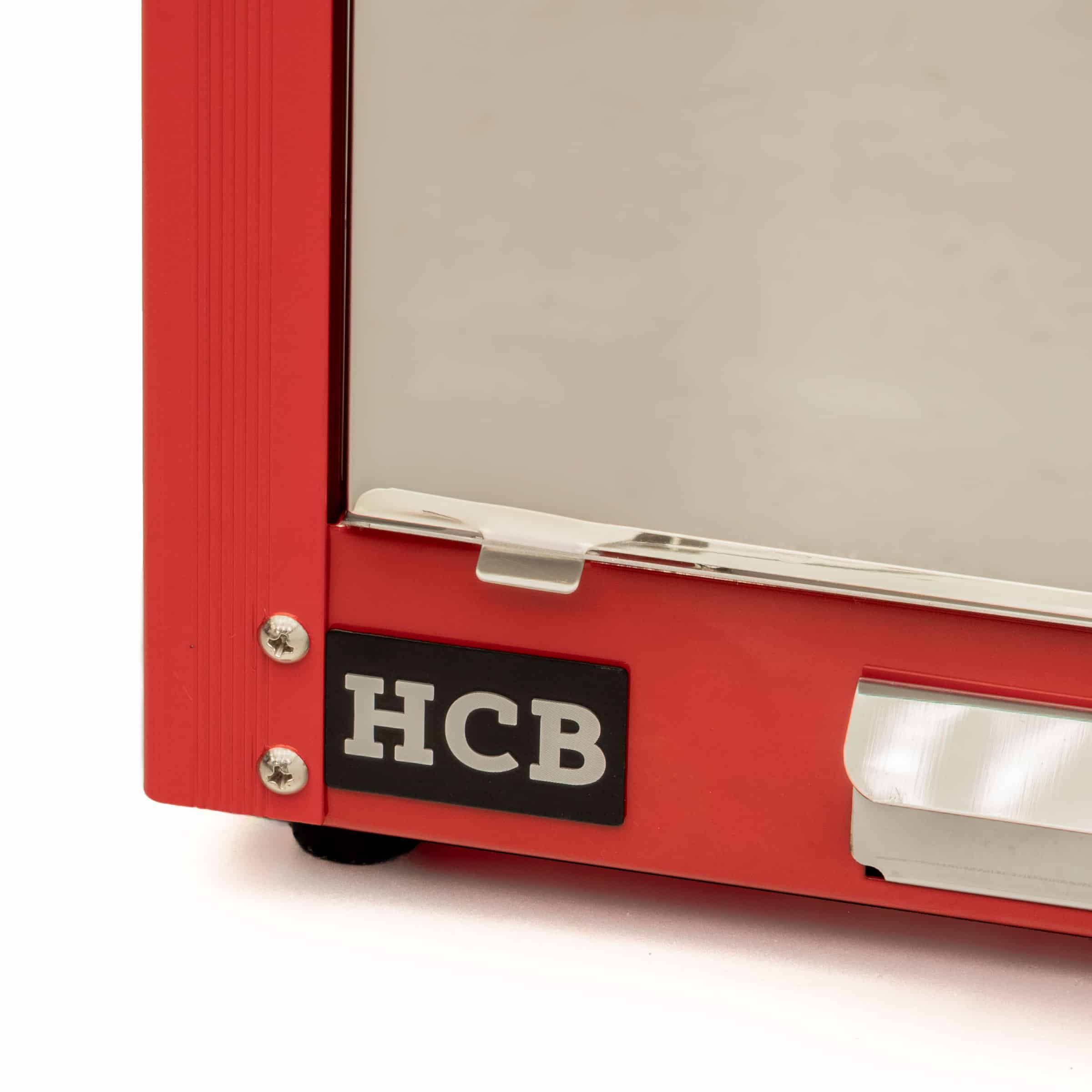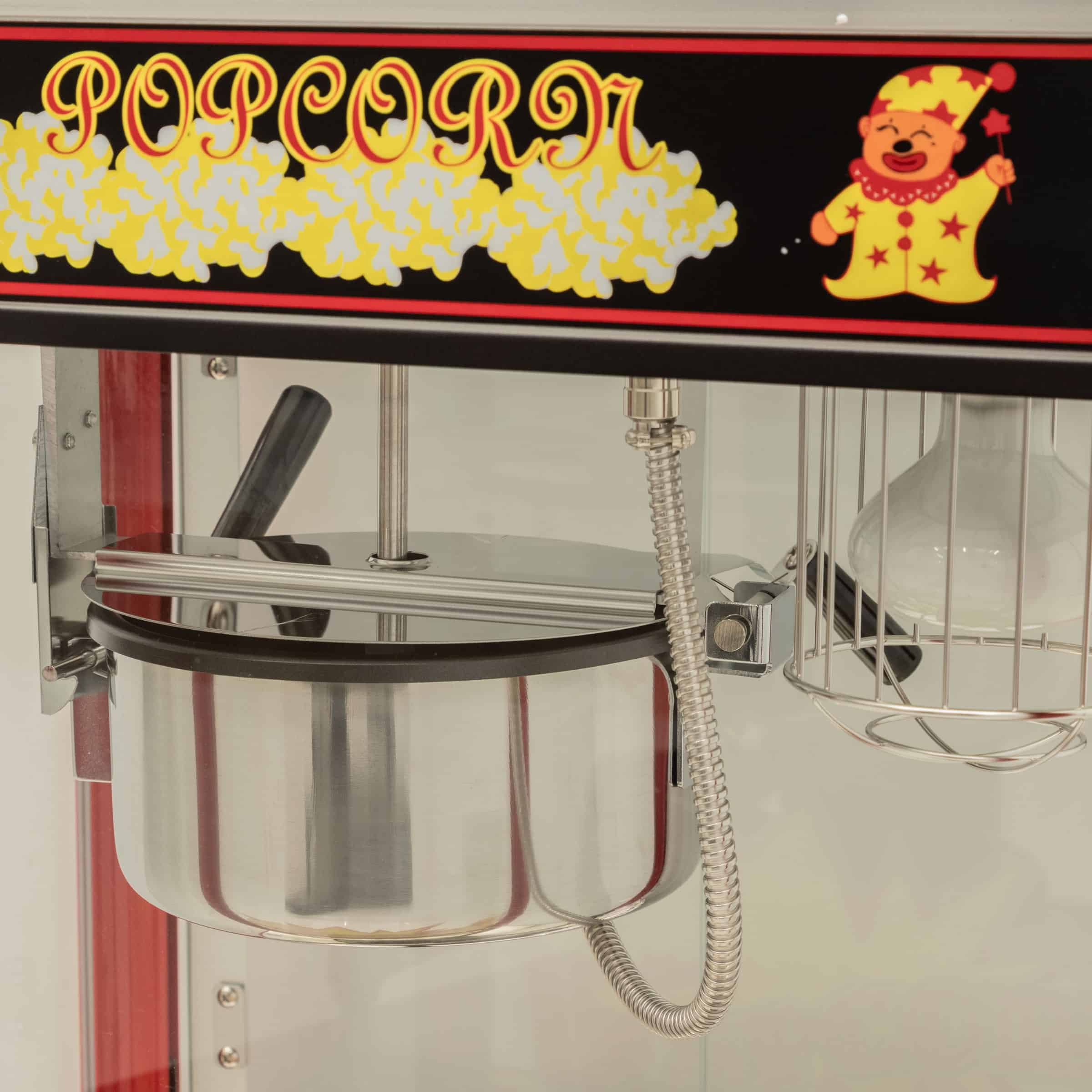 Professional popcorn machine, energy efficient and safe to use. Aluminum alloy frame, robust housing made of tempered glass and red powder-coated steel. The popcorn pan has a stirring unit and is easy to empty thanks to the use of a clamp. The service side has a convenient flap for scooping popcorn as well as a large revolving door made of acrylic glass. The chamber is illuminated to beautifully present the freshly popped popcorn. The convenient crumb tray under the cabinet makes it easy to remove unpopped kernels and crumbs. It takes about 2 minutes to make a batch of popcorn.
