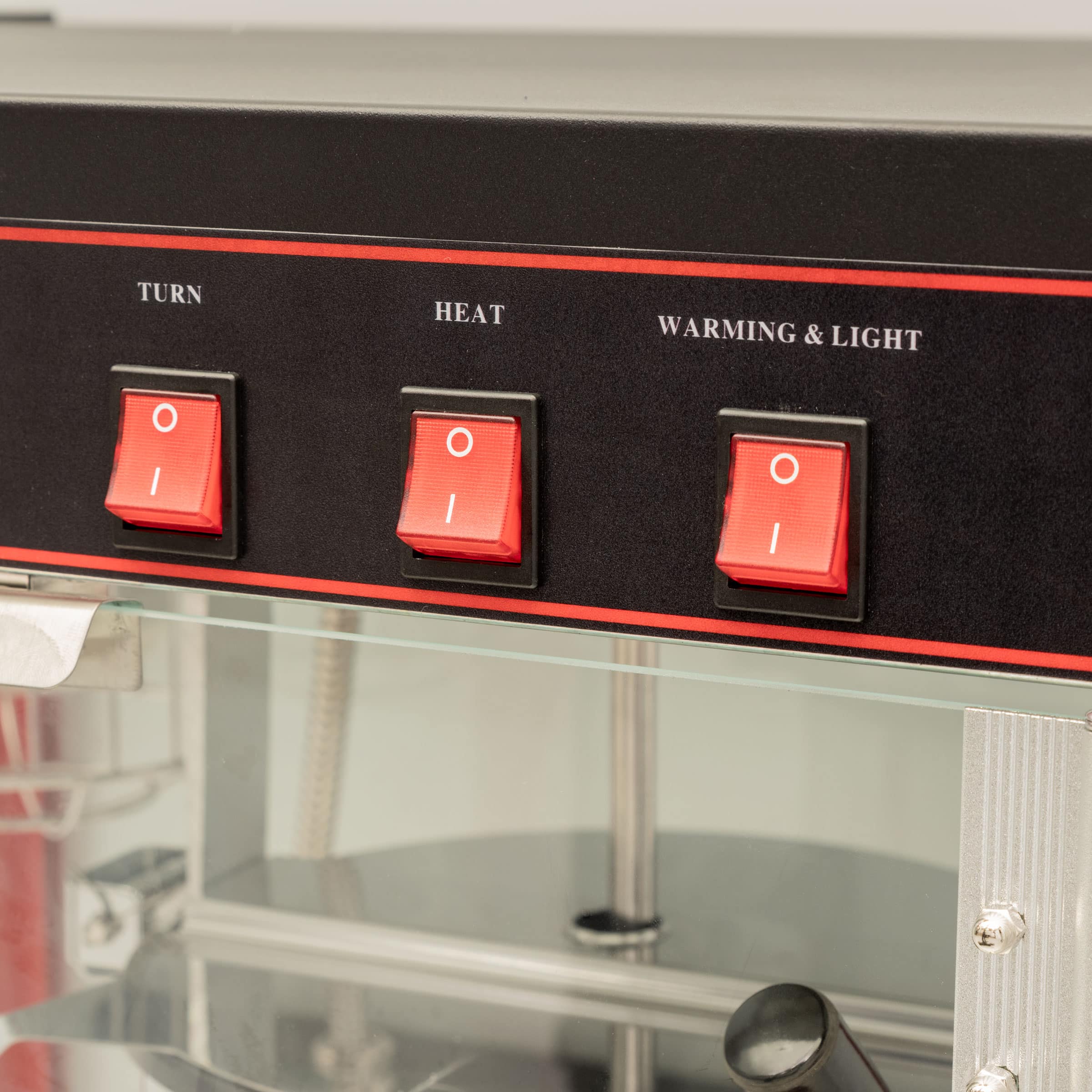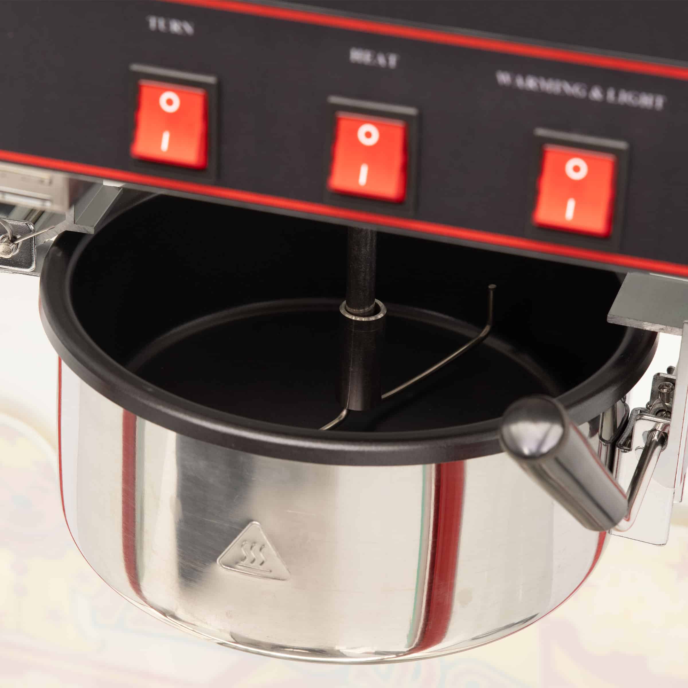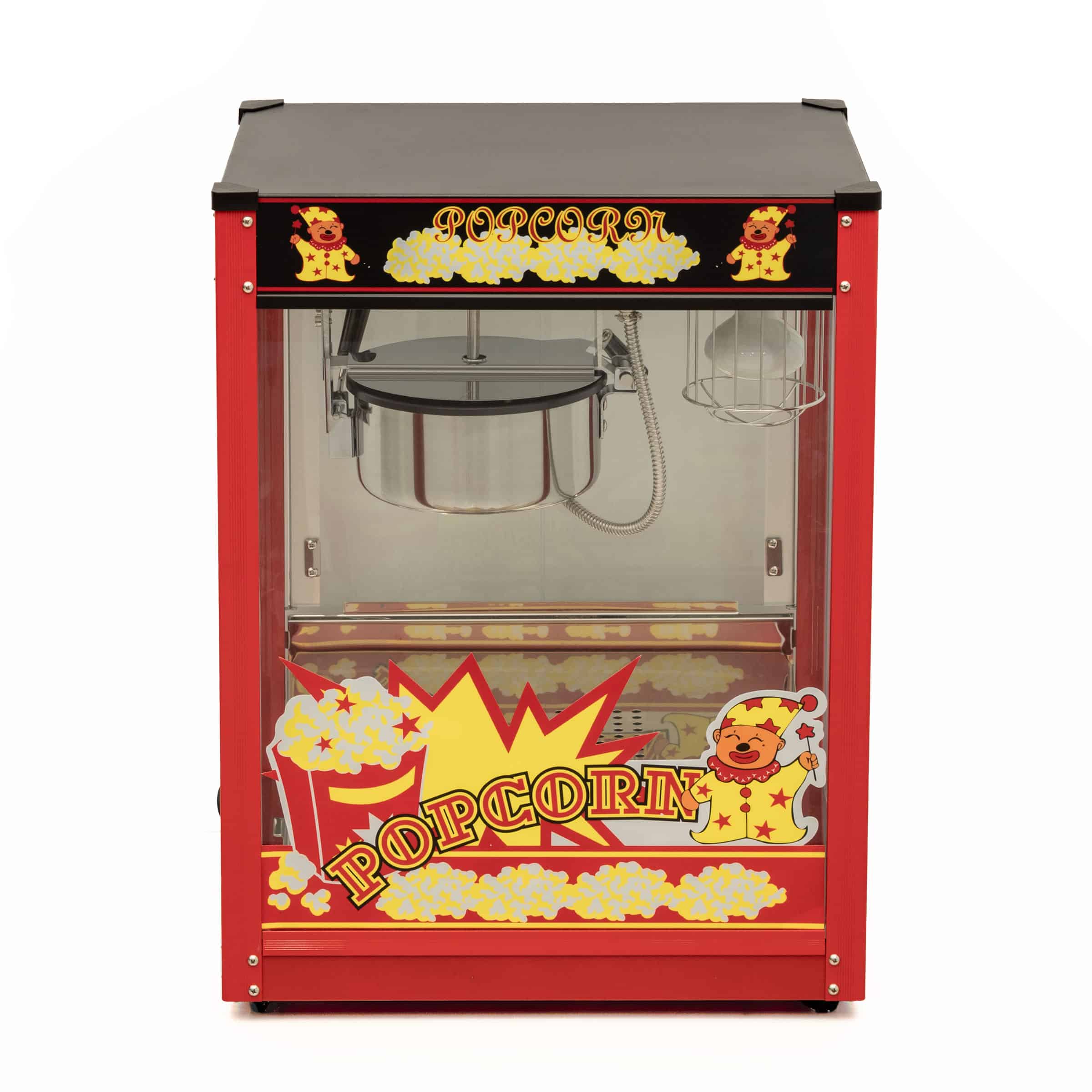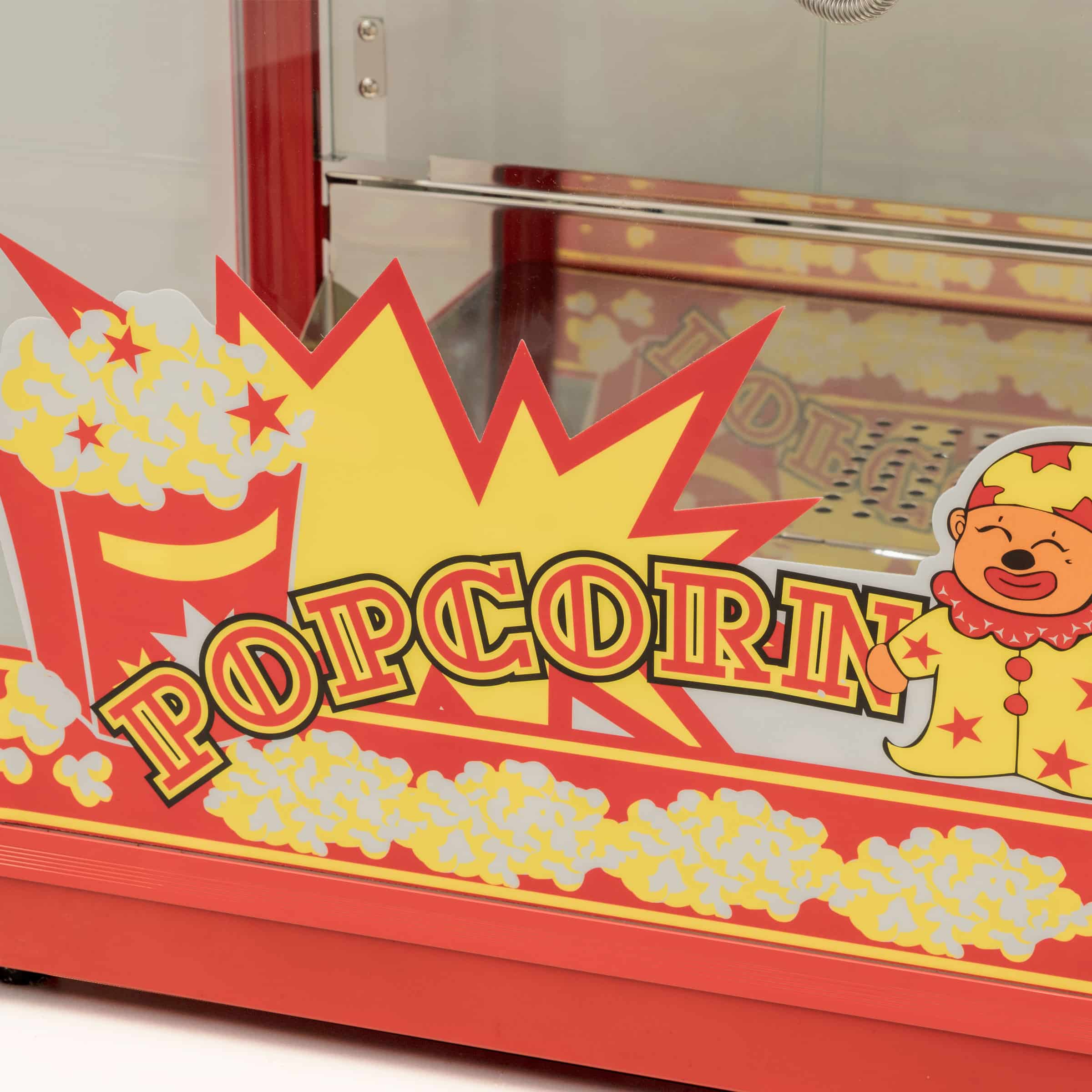 Professional popcorn machine, energy efficient and safe to use. Aluminum alloy frame, robust housing made of tempered glass and red powder-coated steel. The popcorn pan has a stirring unit and is easy to empty thanks to the use of a clamp. The service side has a convenient flap for scooping popcorn as well as a large revolving door made of acrylic glass. The chamber is illuminated to beautifully present the freshly popped popcorn. The convenient crumb tray under the cabinet makes it easy to remove unpopped kernels and crumbs. It takes about 2 minutes to make a batch of popcorn.