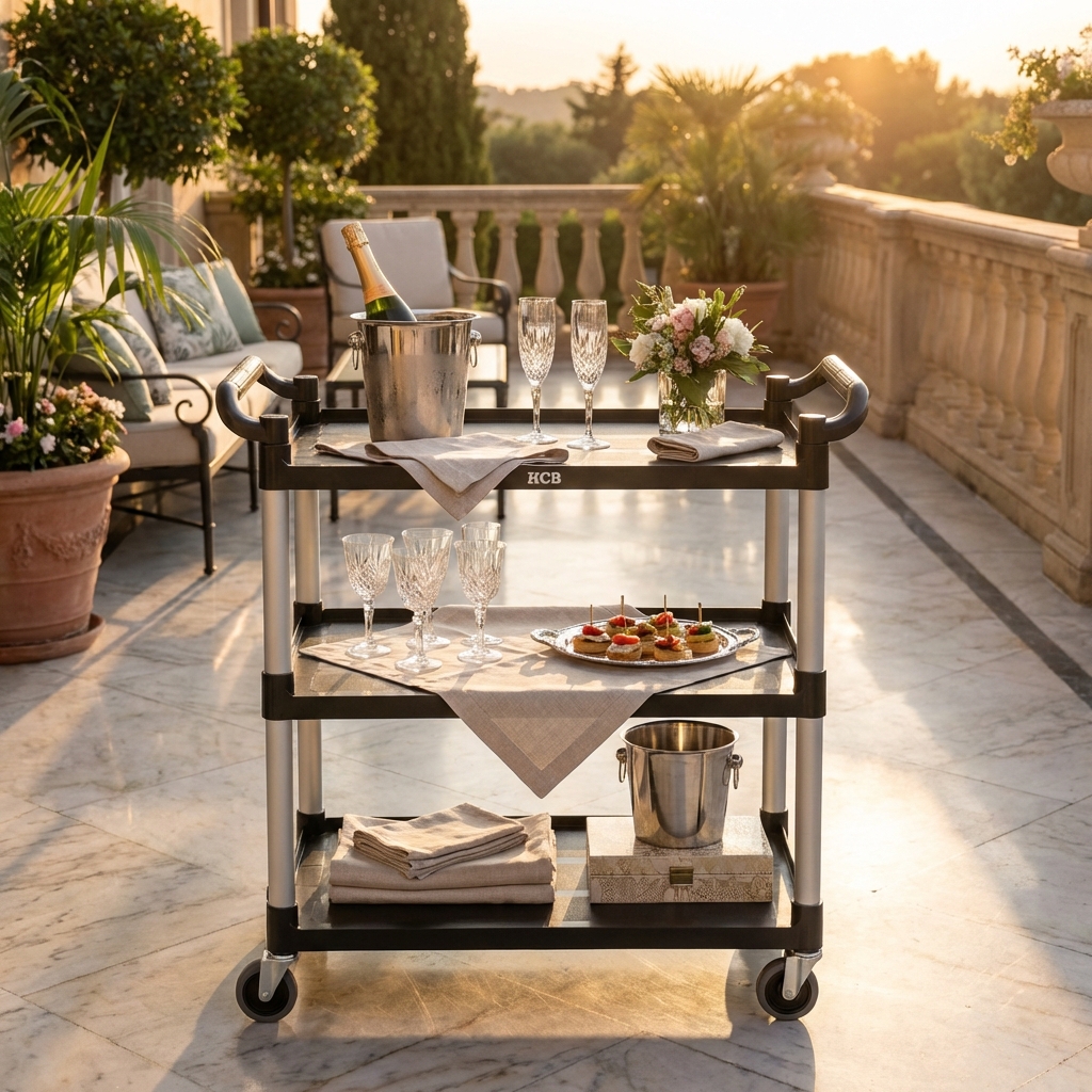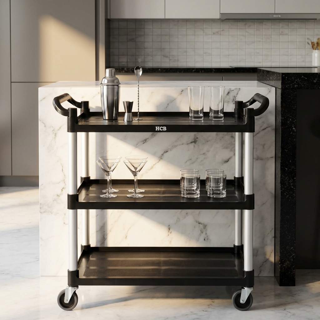 The serving trolley is made of high-quality plastic that is durable and easy to clean. The material is resistant to stains, dents and scratches, making the cart look professional even after heavy use. In addition, the plastic is lightweight, making the cart easy to maneuver even when fully loaded.
