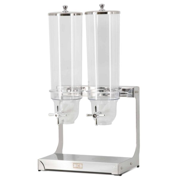 The stainless steel Cereal Dispenser 2 x 3.5 liters from HCB is the solution for stylish and hygienic presentation of breakfast cereals, granola or nuts at any breakfast buffet or self-service point in the hospitality industry. Thanks to its scratch-resistant reservoir and sturdy stainless steel construction, this dispenser is perfect for intensive, daily use. It also provides a luxurious look at home for breakfast or a festive brunch buffet.