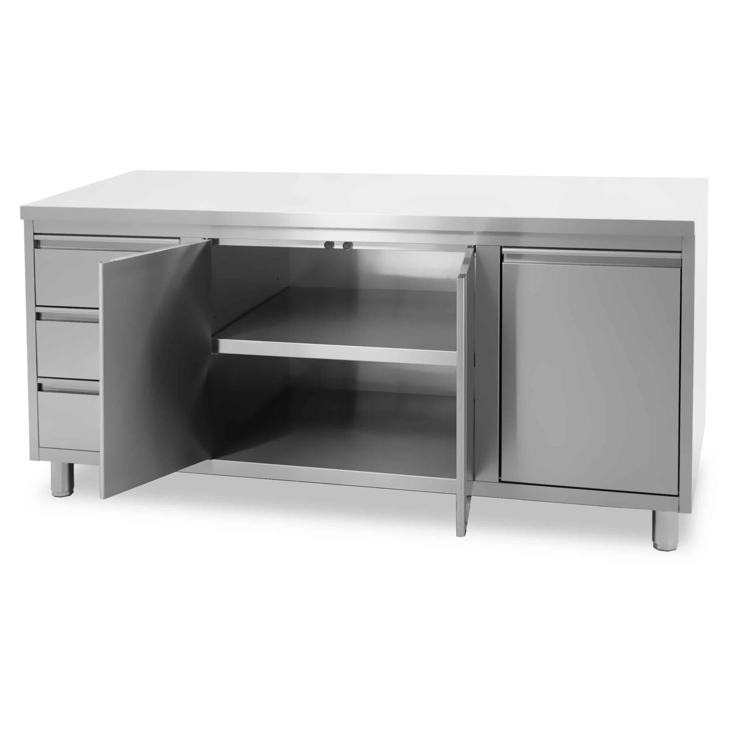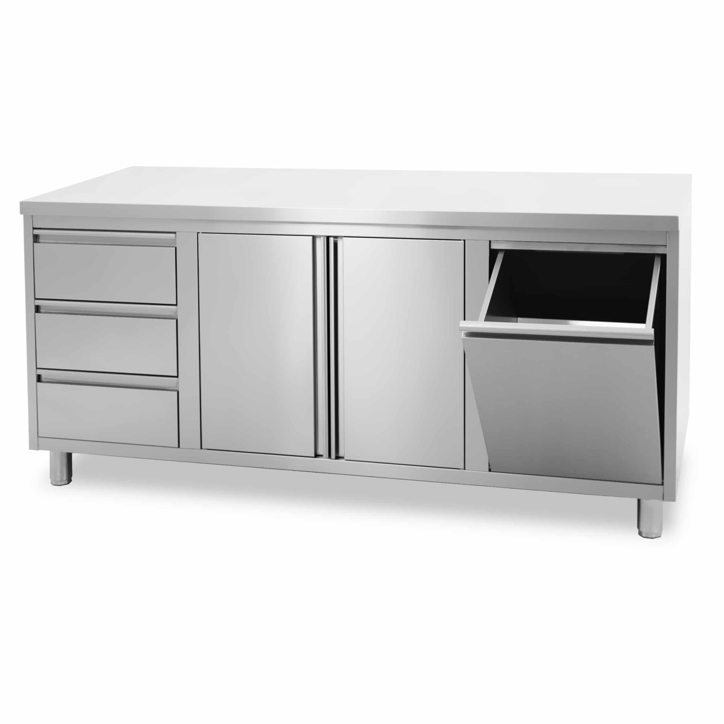 HCB Work cabinet – folding door – 3 drawers – waste bin – 180 cm – stainless steel